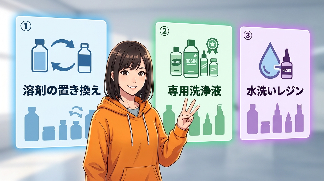 ③「レジン自体を変える」。水洗いレジンに切り替えればそもそも溶剤がいらなくなる