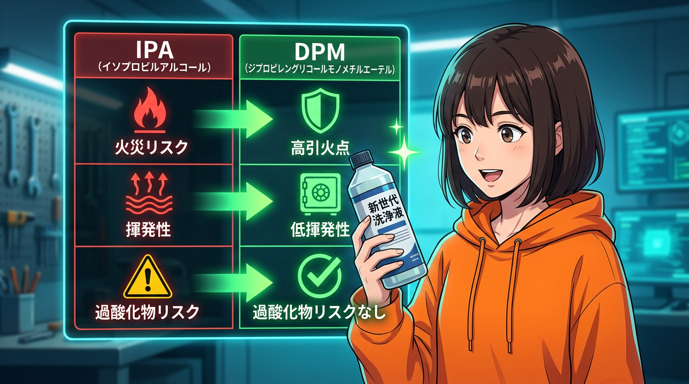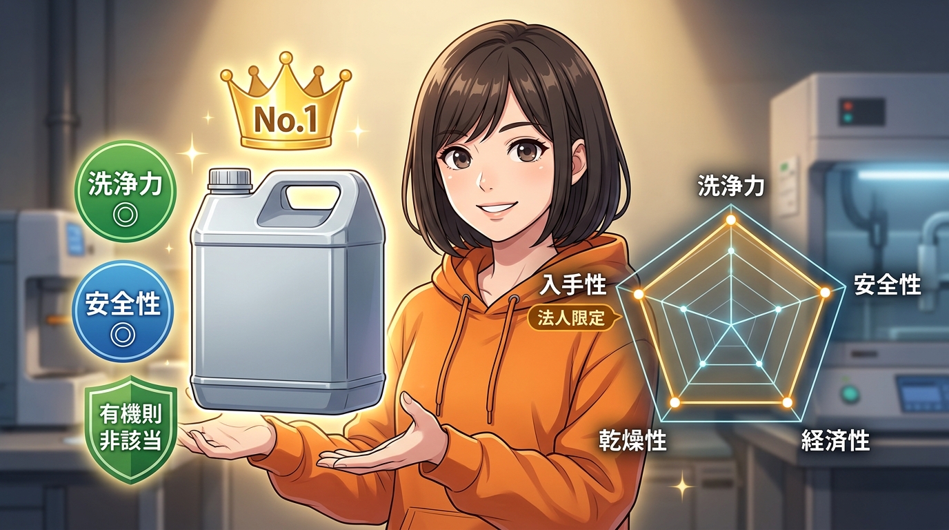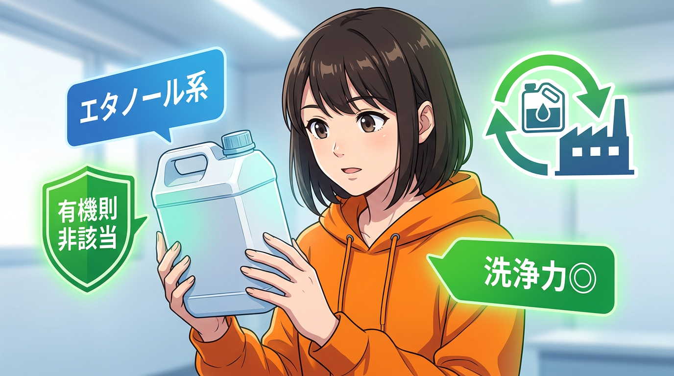 まず「エタコール7」。三協化学が作っている高濃度エタノール製剤で、IPA代替として案内されている製品です。アルコール総濃度99%以上でIPAに近い洗浄力。揮発性もIPAに近くて乾きが速い。臭いはIPAよりマイルドです。メーカー案内では有機溶剤中毒予防規則に該当しないので、法規制面でIPAより扱いやすいとされています。自動洗浄機で使う場合は、必ず機器メーカーの対応可否とSDSを確認してくださいね。