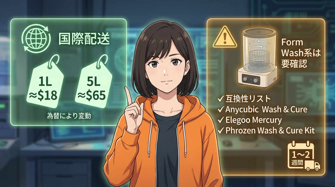 価格はPrusa公式で1Lが約18ドル、5Lが約65ドル。為替や送料で変動するので、最新価格はPrusa公式を必ず確認してください。1つ注意点があって、Formlabs公式はForm Washの推奨洗浄液としてTPMや自社の専用洗浄液を案内しています。DPMをForm Wash系で使う場合は、対応可否を必ずメーカーに確認してください。Prusa CW1SやELEGOOのMercuryなどアルコール以外にも対応する機種では使いやすいと案内されています。海外発送なので届くまで1〜2週間かかる点も考慮しておいてください。