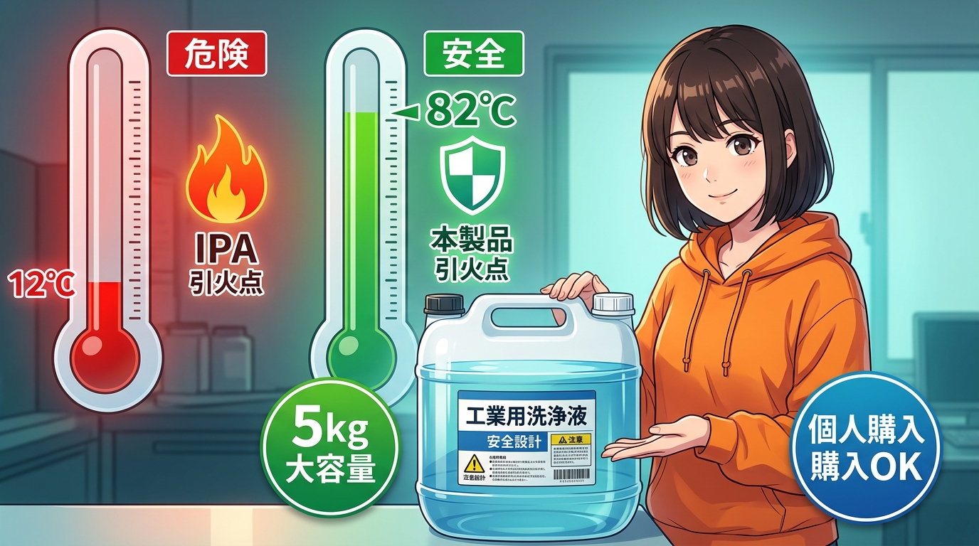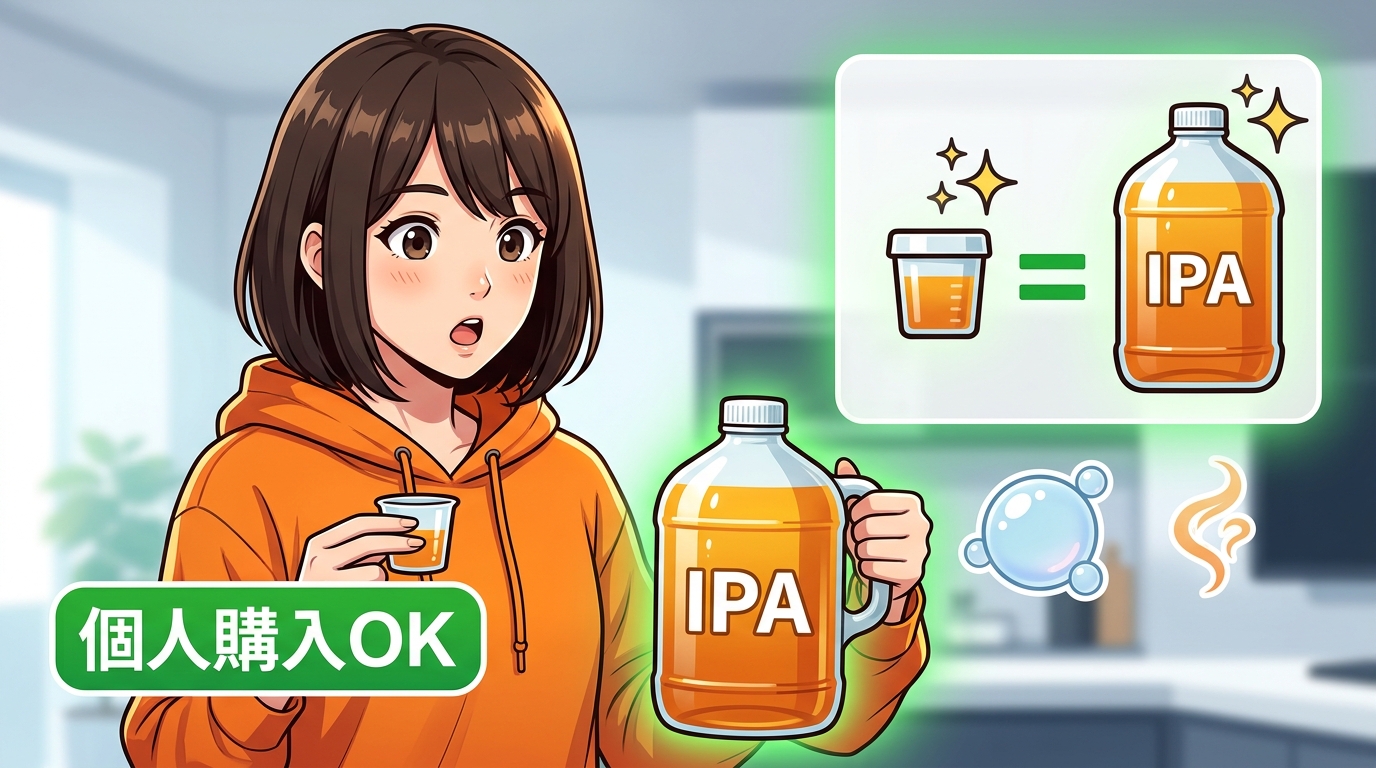 個人で比較的手に入りやすいのが無水エタノールです。ドラッグストアでもAmazonでも買える。消毒液のベースとしても日常的に使われている成分で、洗浄力もIPAと遜色ないという評価が多く、SK本舗も代替候補として紹介しています。ただし無水エタノールも可燃性のある溶剤なので、換気や火気管理、保護具は必要です。