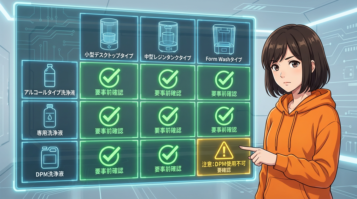 エタコール7や無水エタノールのようなアルコール系であれば、置き換えやすいケースは多いです。ただし洗浄機の樹脂槽の材質、シール材、コーティング、撹拌方式によって相性が変わります。SKレジンウォッシングとELEGOOレジン洗浄剤も各社の洗浄機で使えると案内されていますが、他社機種に入れる場合は必ず事前確認を。