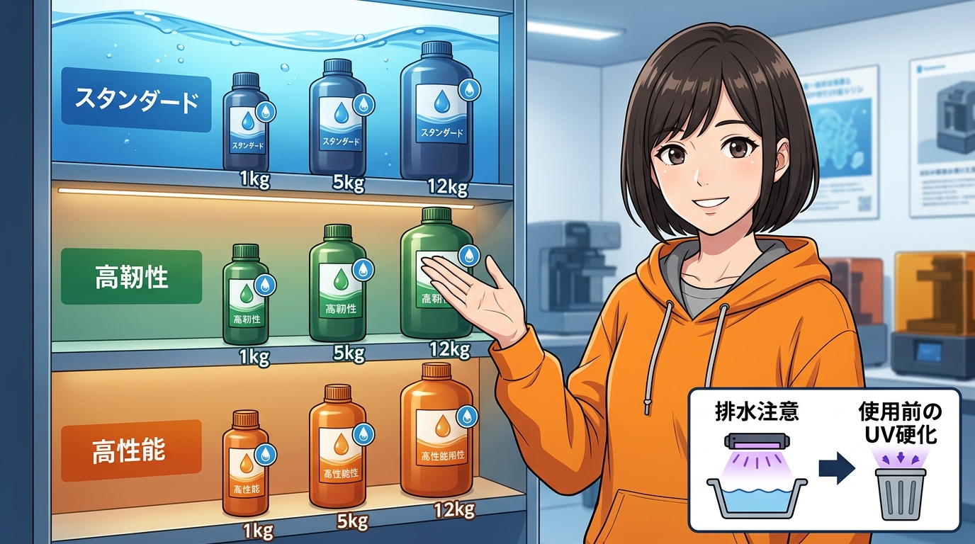 SK本舗は標準タイプから高靭性、高性能、10K対応まで水洗いレジンのラインナップを揃えています。ELEGOOも水洗いレジンV2.0を1kg、5kg、12kgの大容量で展開中。昔は「水洗いレジンは品質が落ちる」と言われていましたけど、最近の製品はかなり改善されています。
