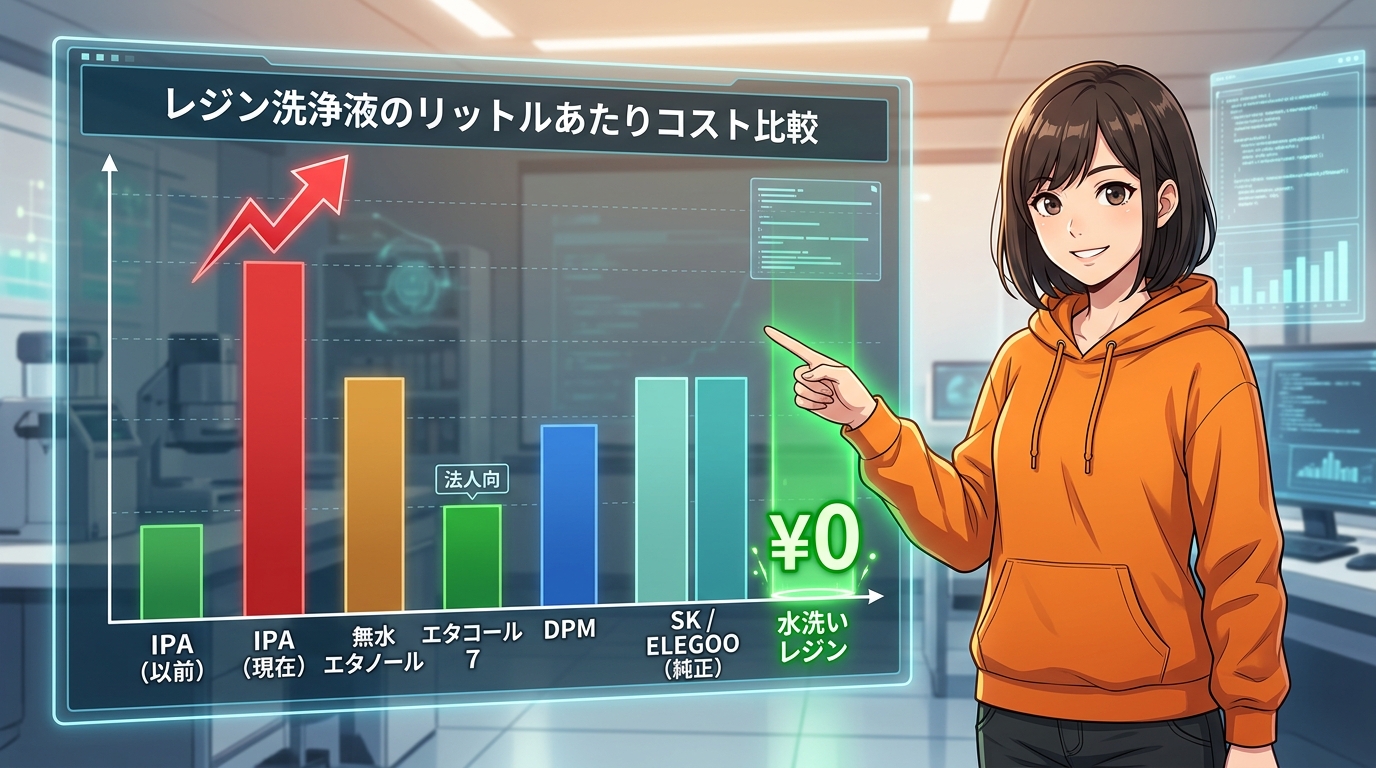 運用コストの観点では、水洗いレジンへの切り替えが選択肢として有力ですが、造形物の用途や後処理の手間も含めて相性を見たほうが安全ですね。