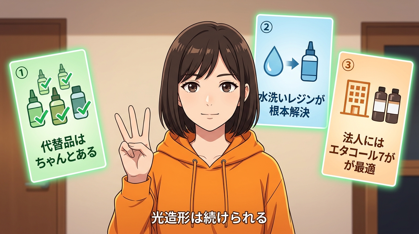 2回にわたってIPA品薄問題をお届けしました。前回の「なぜ消えたのか」と今回の「何を使えばいいの?」で、全体像がつかめたんじゃないかなと思います。IPAがなくても光造形は続けられますので、ぜひ代替品を試してみてください。