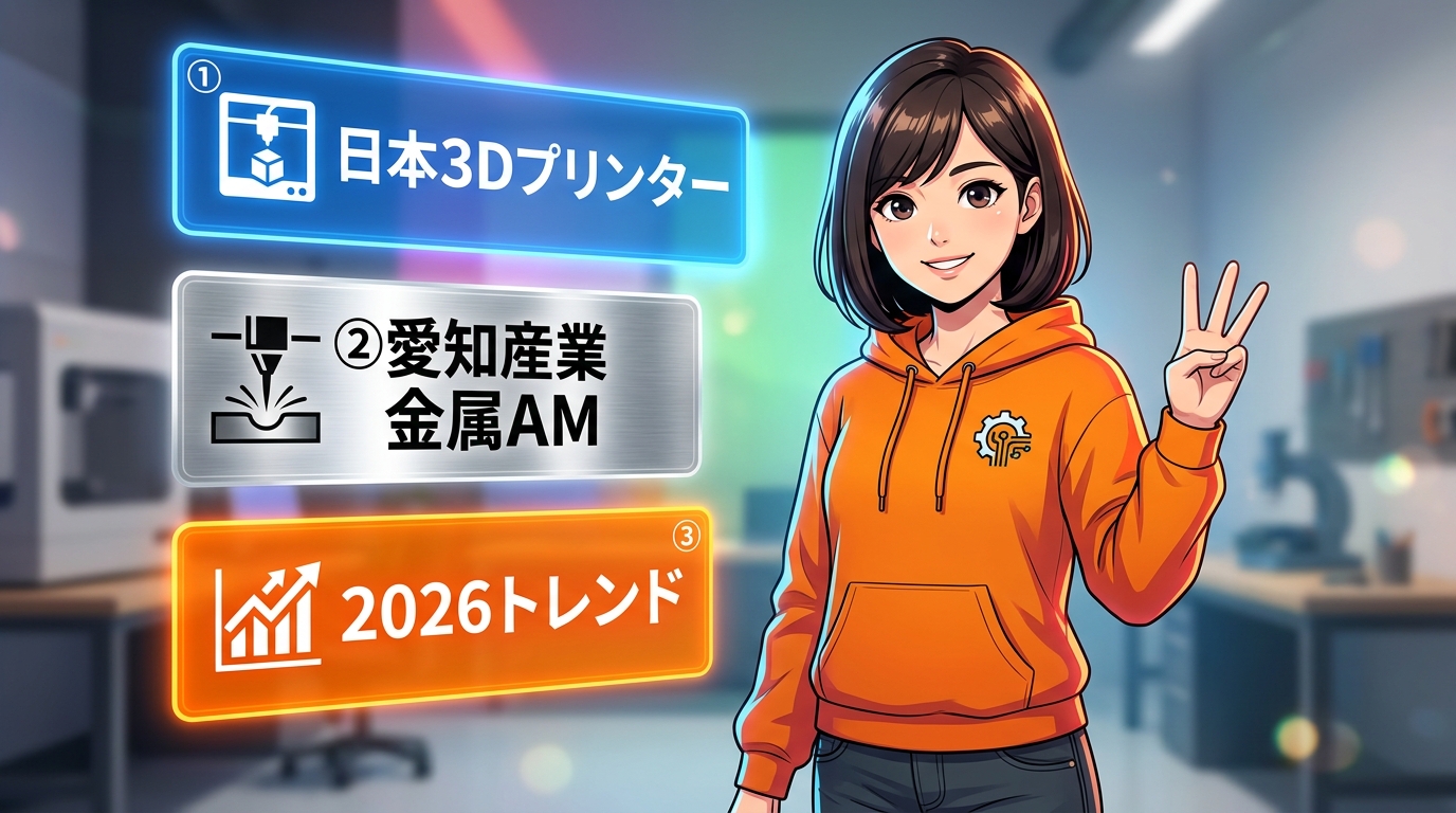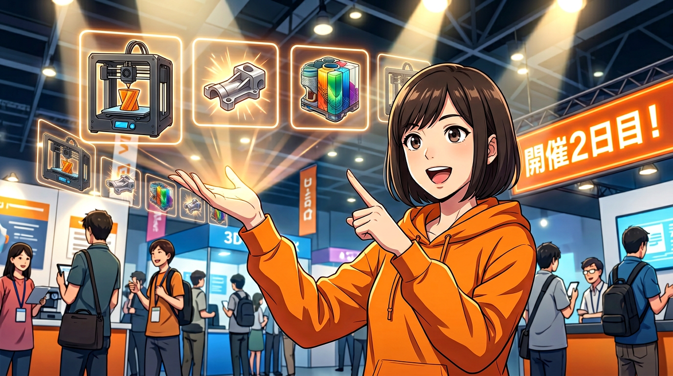 今日はその続きで、「日本3Dプリンター」さんの注目機3台、「愛知産業」さんの金属AM 4方式、リコージャパンさん、マツボーさん、丸紅情報システムズさんのStratasys、Artec 3Dさんのスキャナー、そして最後に2026年の3Dプリンタートレンド総括までを一気に走ります。今日会場に行ける方は、残り2日間の見どころマップとしても使ってください。
