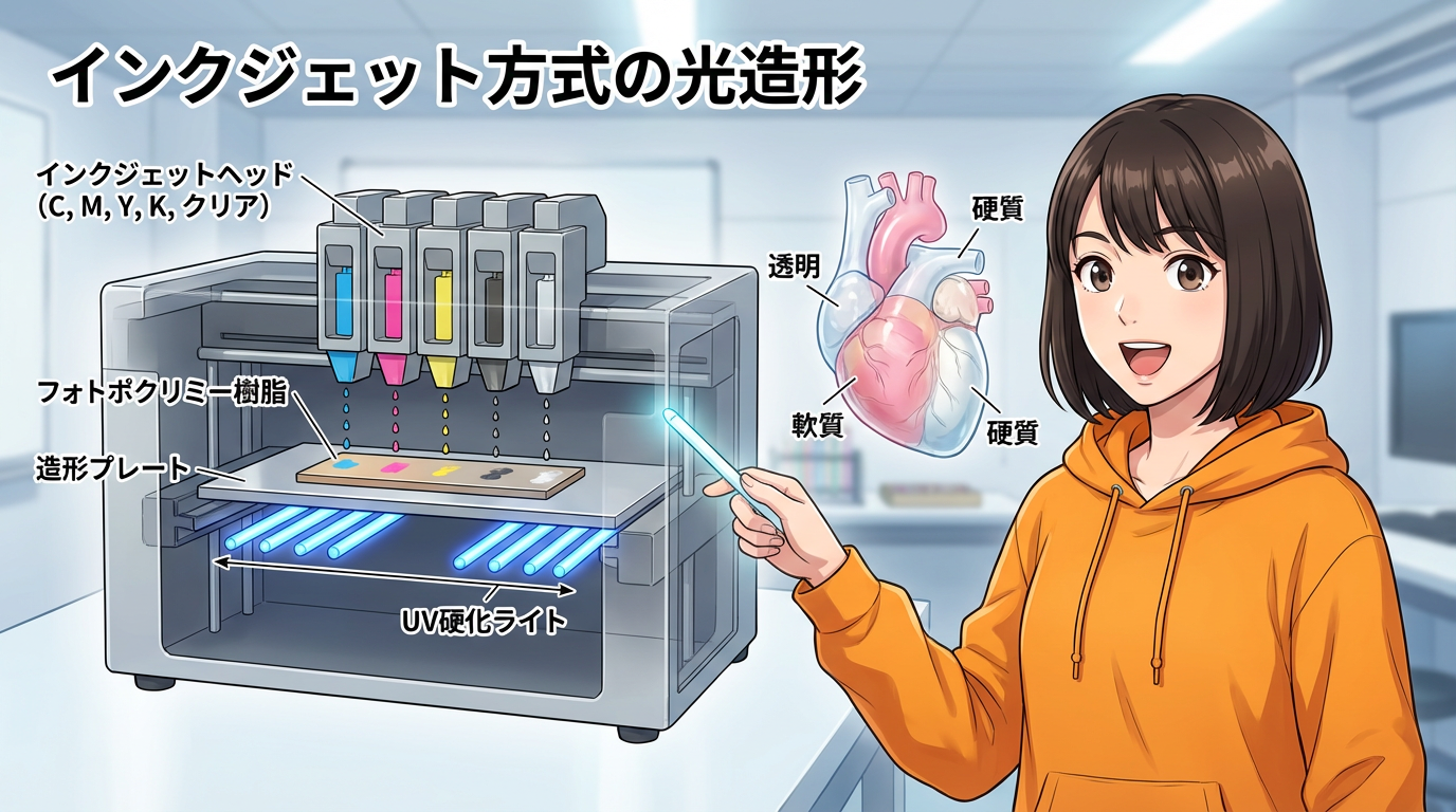 PolyJetは「インクジェット方式の光造形」と言うとわかりやすいかもしれません。