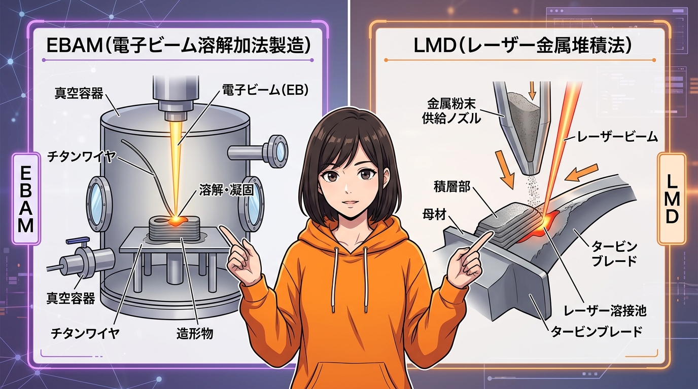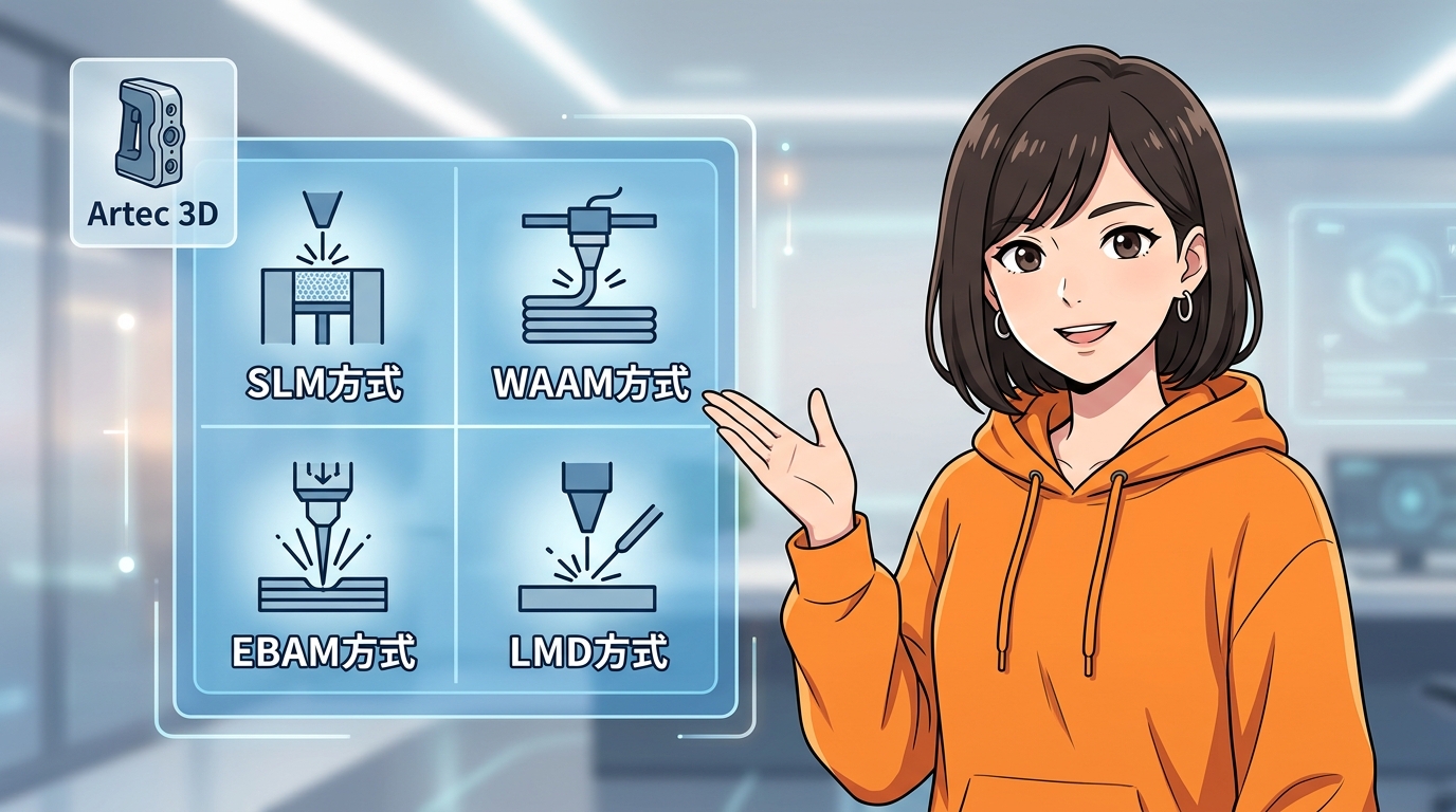4方式を一言でまとめると、SLMは精度重視の粉末方式、WAAMは大型造形向けの溶接応用、EBAMは活性金属の大型造形、LMDは補修・機能付加向け、というイメージです。