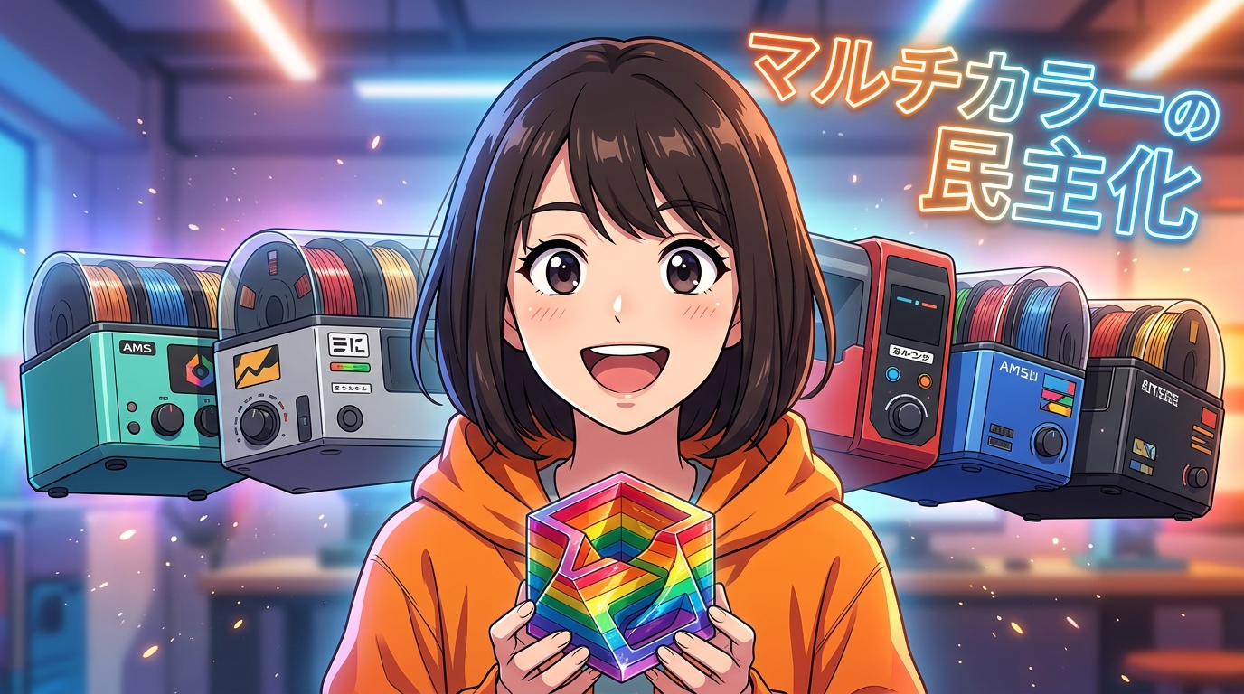 1つ目が「マルチカラー/マルチマテリアルの民主化」。BambuLabのAMSが切り開いたマルチカラー体験に対して、競合各社がどんどん追従しているんですよ。