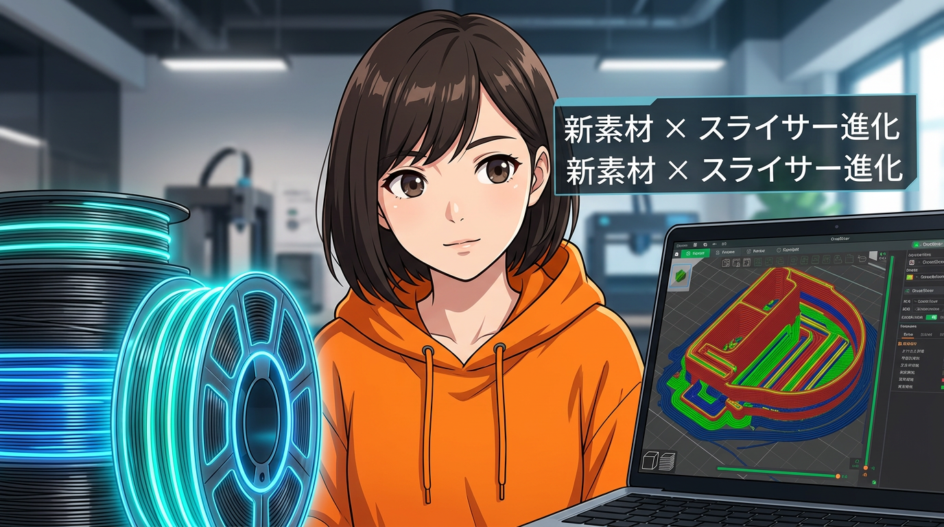 5つ目が「スライサーソフトの進化」。OrcaSlicerはBambu Studioからの派生で、多メーカー対応のオープンソース。キャリブレーション機能が充実していて、BambuLabユーザーにも人気です。