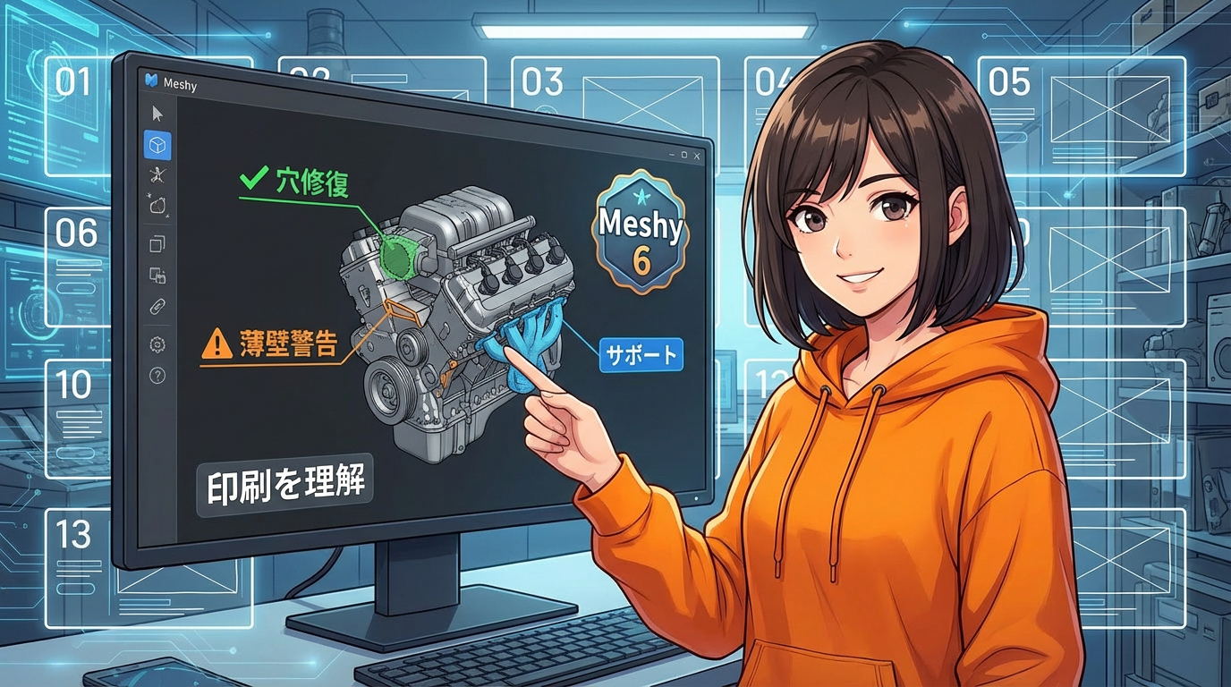 具体的には、メッシュに穴が開いていたら自動修復する。壁が薄すぎる部分があったら警告する。サポート材が必要な箇所を教えてくれる。つまり「生成→印刷」の間のつまずきポイントを先回りしてケアしてくれるんです。