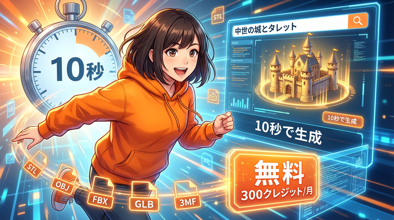 出力形式は、STL、OBJ、FBX、GLB、3MF。3Dプリンターで使う形式は全部揃っています。そして個人的に一番おすすめなのが無料枠の存在。月300クレジットの無料枠があるので、軽く試すには十分な量です。