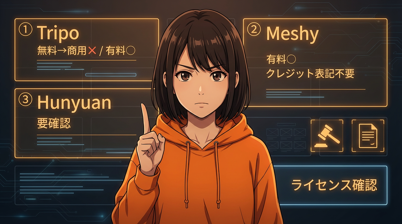 Meshyは、無料プランだとCC BY 4.0ベースでの利用になります。有料プランだとより扱いやすい権利条件になって、クレジット表記なしで販売もできます。販売目的なら、最新の利用条件を公式サイトで確認した上で有料プランを選ぶのが無難です。