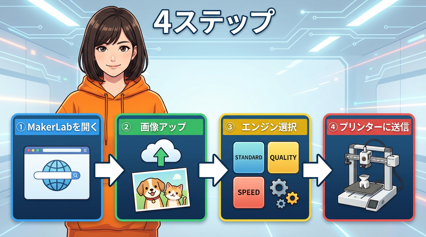 好きなエンジンを選んで使えます。使い方は信じられないくらい簡単で、MakerWorldを開いて、MakerLabに移動して、画像をアップして、エンジンを選んで「生成」を押すだけです。