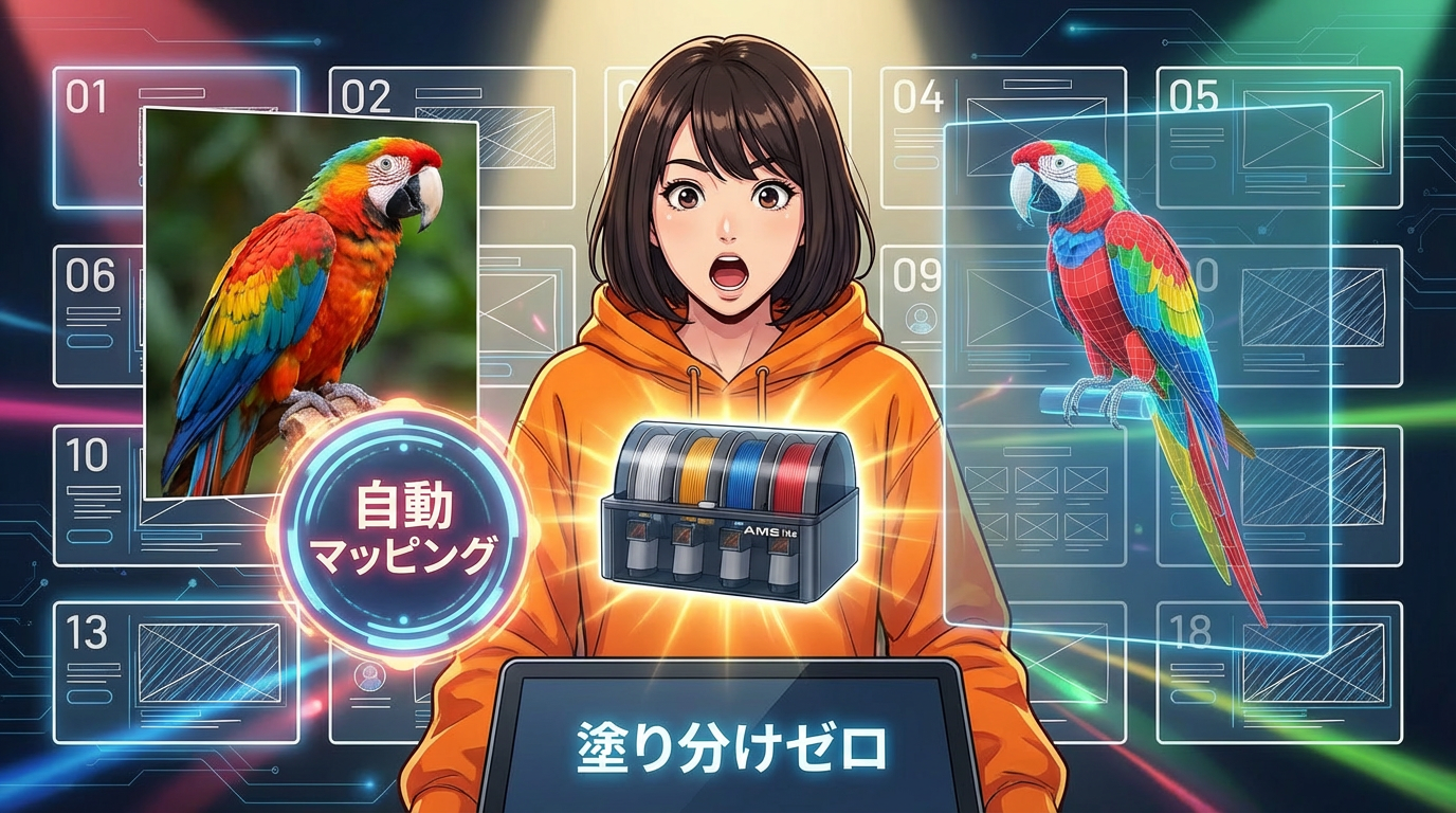 これまでマルチカラー印刷って、モデルをBambu Studioで開いて、表面を「ここは赤」「ここは青」って1つずつ手動で塗り分けないといけなかったんですよね。複雑なモデルだと30分から1時間かかることもある。この作業がめんどくさくてマルチカラーを諦めた方、結構多いと思います。