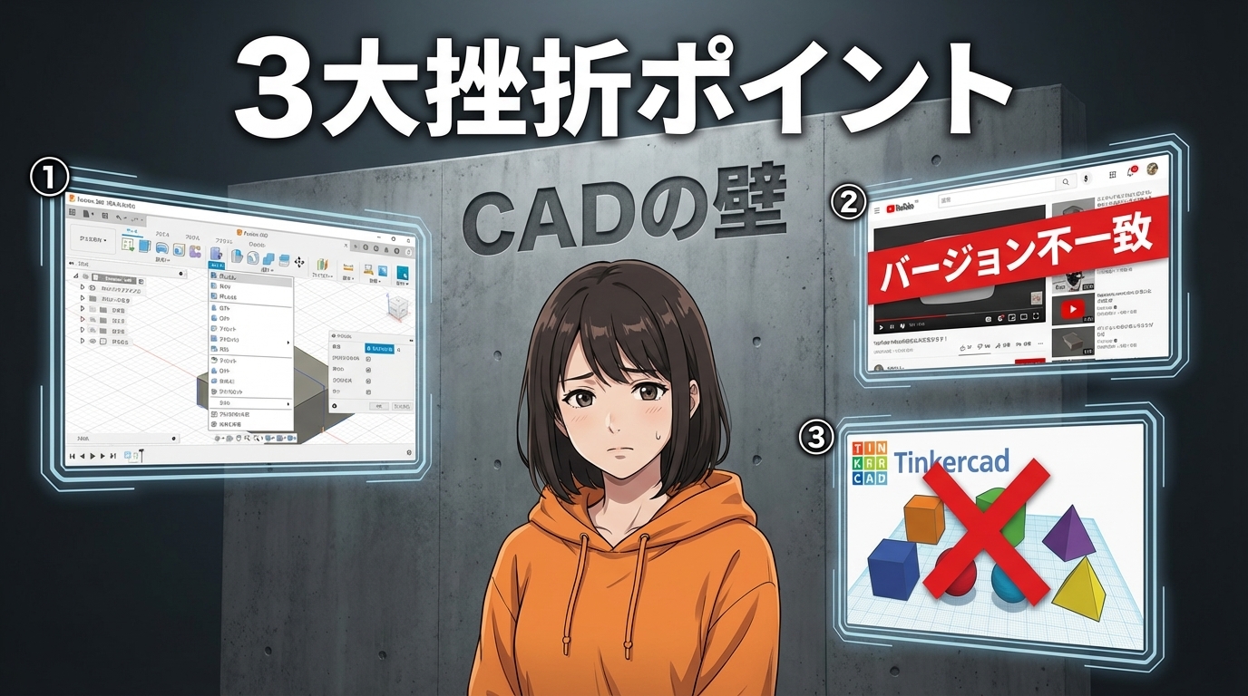 僕はFusion 360を10年以上使っているので忘れがちなんですけど、3Dプリンターに入るときの一番大きな壁って、実は「CADソフトが使えない」ことなんですよね。挫折ポイントは主に3つあると思っています。