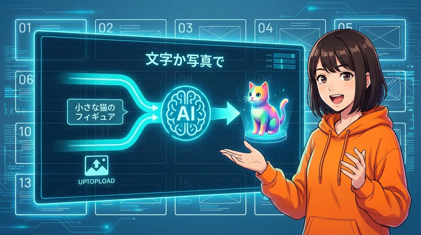 テキスト生成なら「小さな猫のフィギュア」と入力すると、数秒から十数秒で色付きの猫が出てくる。画像生成なら写真をアップすると、AIが横や後ろの形状も推測して立体に変換してくれる。CADの知識はゼロでOKです。「こんなものが作りたい」を言葉か写真で伝えるだけ。