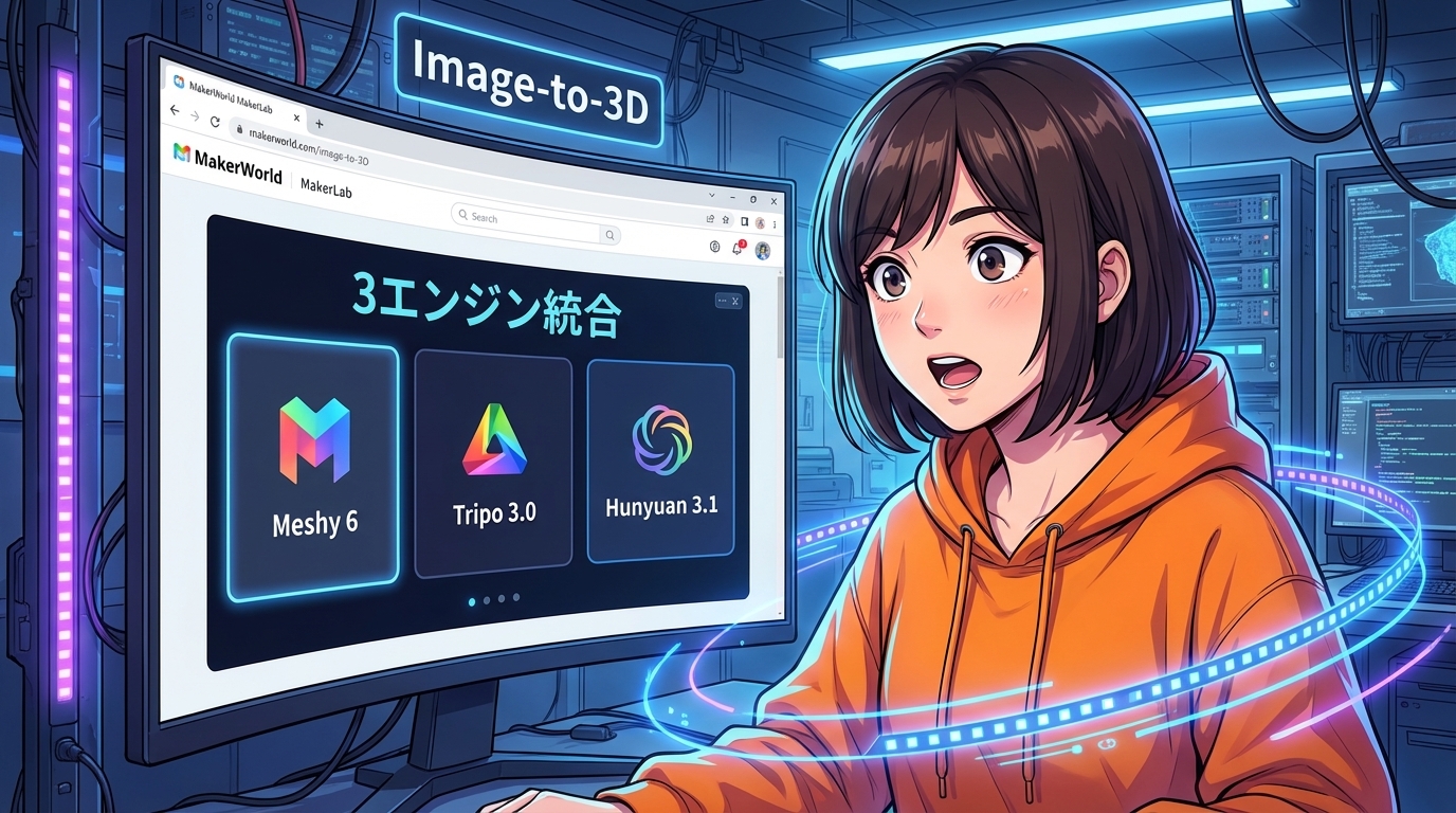3Dプリンター最大のハードルだった「CADの壁」は、AI生成ツールの登場で確実に低くなりました。MakerWorldにMakerLabが追加されたことで、A1 miniユーザーなら「いつもの場所」で写真1枚から3Dモデルを作れるようになった。複数のエンジンから選べて、新規登録の無料クレジットで試せる。Meshyのカラー対応を使えばマルチカラーの手間もかなり減らせる、というのが2026年時点の現在地です。