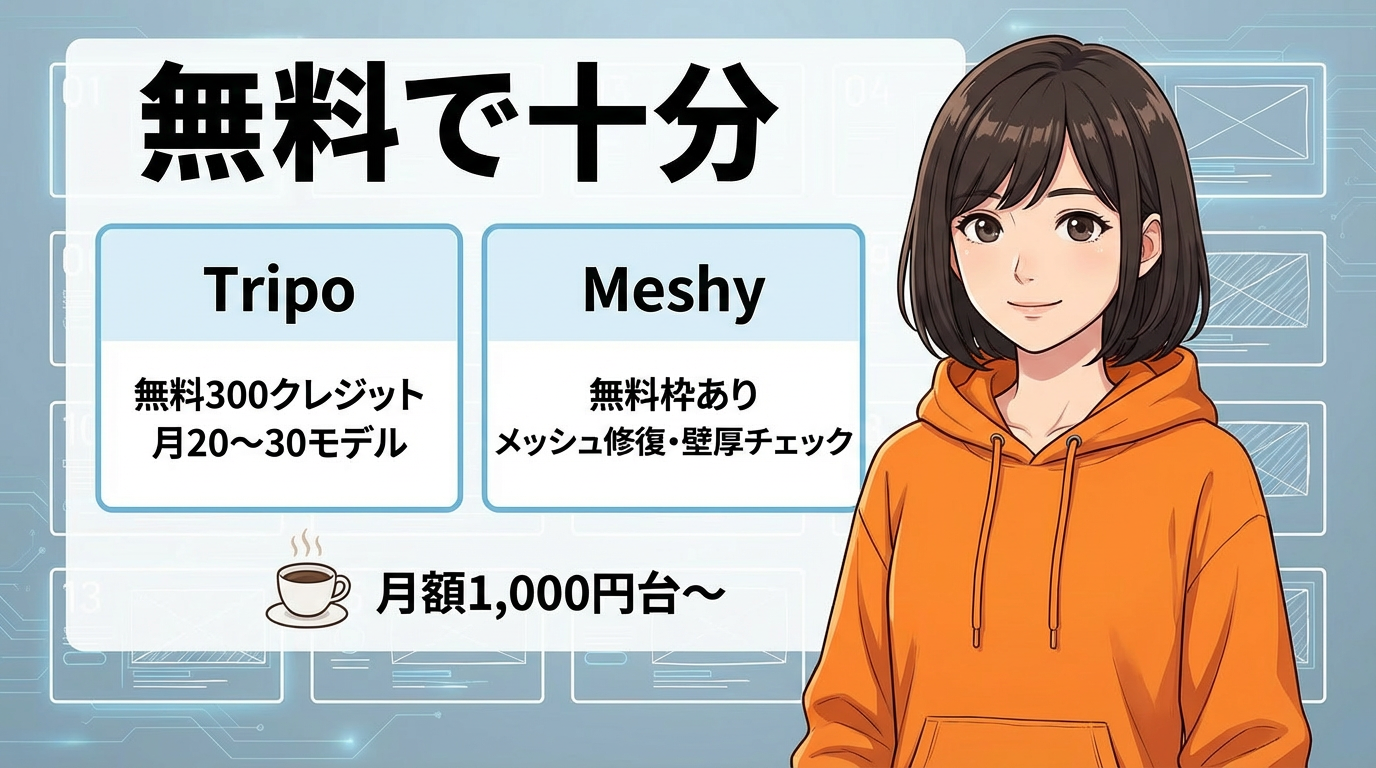 Meshyにも無料枠はあります。クレジット数ではTripoの方が多い印象ですが、Meshyは3Dプリントに特化した後処理機能が充実しているんですよね。メッシュ修復とか壁厚チェックとか。印刷品質重視なら、Meshyの方が「失敗が少ない=フィラメントの無駄が少ない」というコスパの良さがあります。