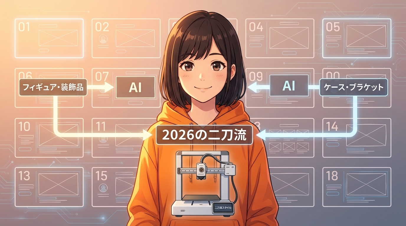 でも、皆さんが作りたいものの全部が、寸法精度命のブラケットじゃないですよね。「フィギュアが作りたい」「部屋の飾りが作りたい」。そういう見た目重視のものはAIに、寸法重視のものはCADに。この「二刀流」が2026年の新しいスタイルだと僕は思っています。