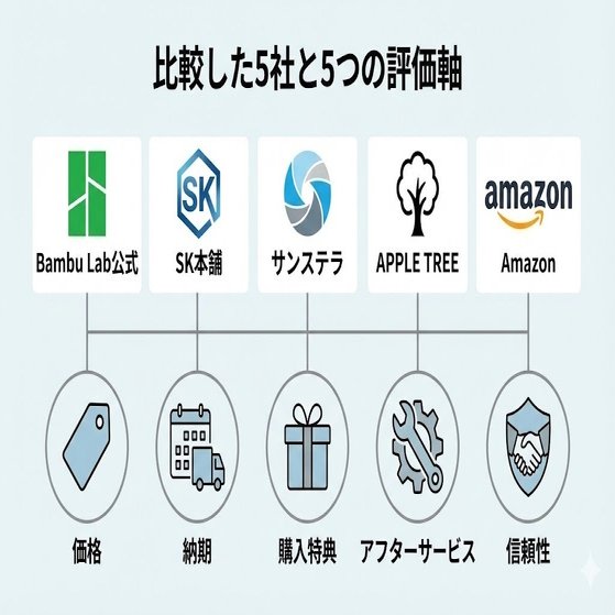 これらを価格・納期・購入特典・アフターサービス・信頼性の5つの軸で比較しました。