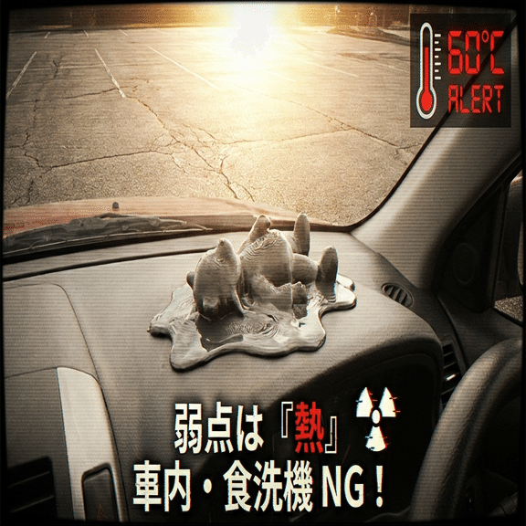 ダッシュボードは70℃を超えます。PLA+で作ったスマホホルダーは、夏の日差しを浴びると飴細工のようにグニャリと曲がります。