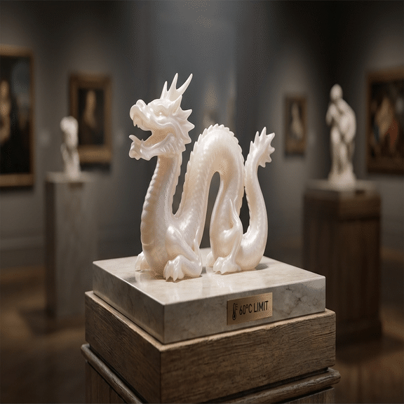 これは、樹脂が「カチカチのガラス状」から「フニャフニャのゴム状」に性質を変える温度のこと。この温度を超えると、作品は剛性を失い、重力に負けて変形します。