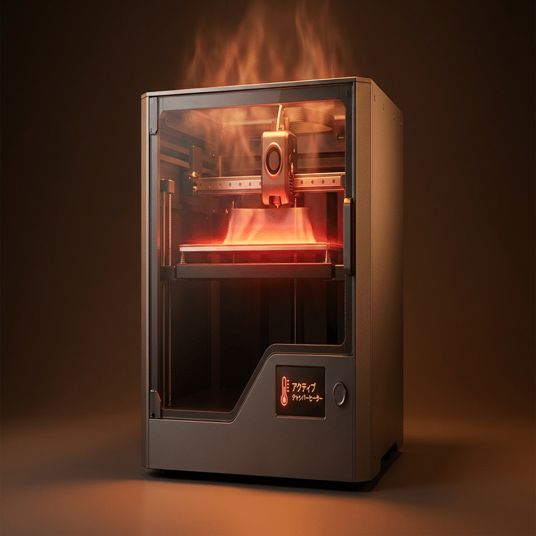 普通のエンクロージャー付きプリンターって、Bambu P1Sとかも含めて、庫内を温めるのはベッドの熱に頼ってるじゃないですか。いわゆる「パッシブ」な加熱ですよね。