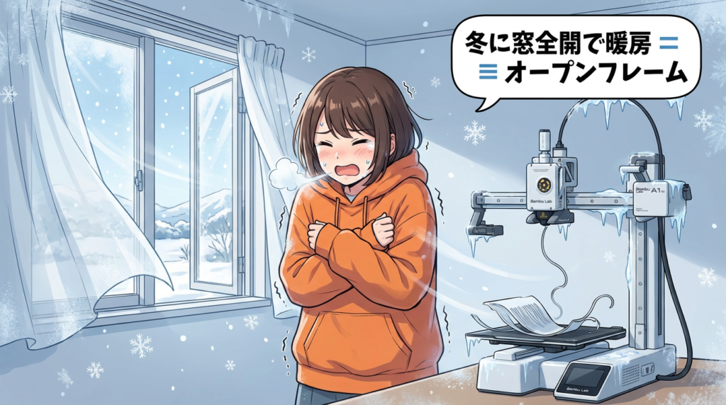 エアコンの風とか、人が歩いた微風でも、造形物の温度がガタガタ変わって反りの原因になる。密閉型のX1Cだと庫内を40〜60℃に保てるけど、A1 miniにはその機能がないんですよね🤔