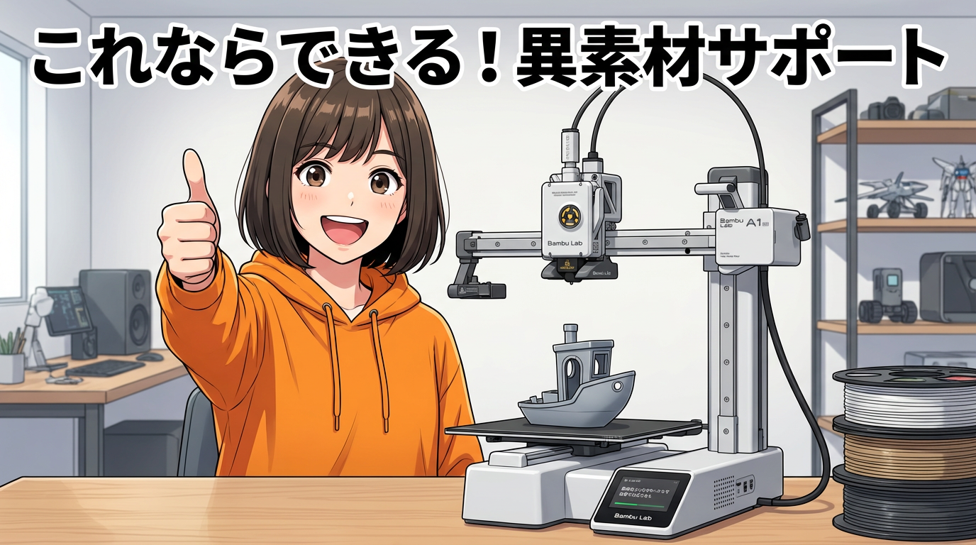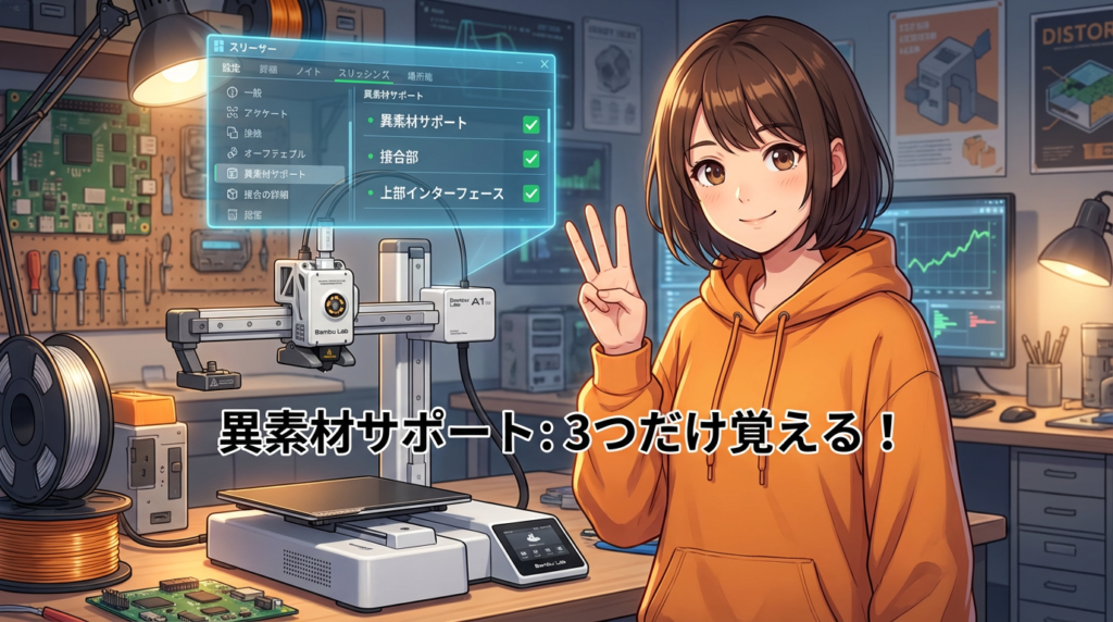A1 miniの「反り」に悩むすべての人へ。PLAとPETGが化学的にくっつかない性質を利用した「異素材サポート」の仕組みと、スライサー設定の3つのコツを、身近なたとえでわかりやすく解説します✨