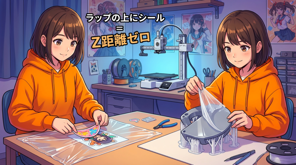 コツ② Z距離をゼロに ─ ラップの上にシール