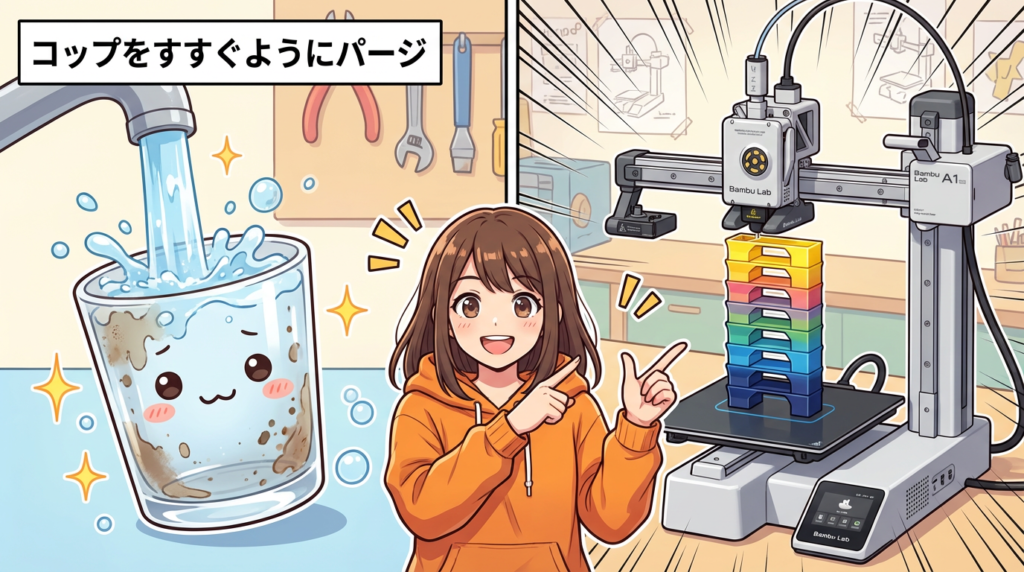 Bambu Studioの自動計算は「色移り」基準なので、異素材の場合はちょっと多めに設定するのが安全。まずデフォルトで一回刷ってみて、色ムラや筋が出たらパージ量を増やしていくのがおすすめです✨