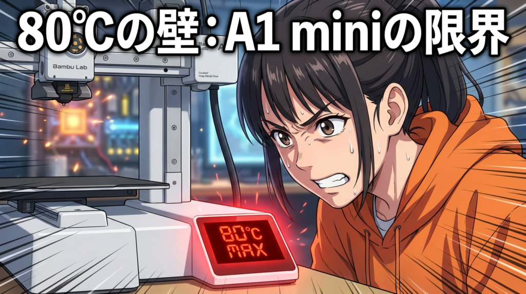 「え、80℃って熱いじゃん、十分でしょ」って思うかもしれないけど、ABSっていう素材は90〜110℃欲しい。つまり、A1 miniのスペックだと物理的に足りないんですよ🤔